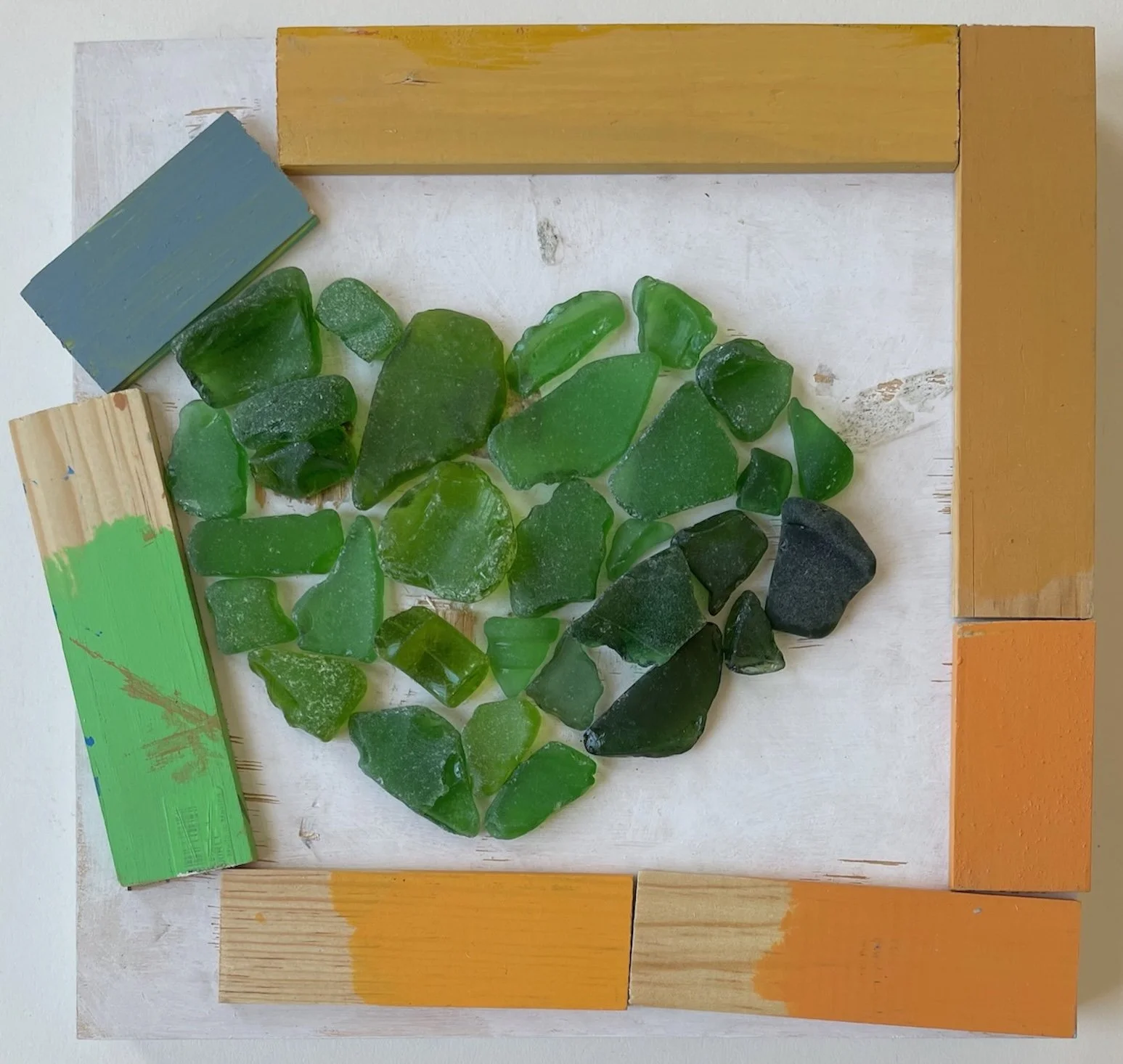 In Bloom, 10 3/4x10x3/4” painted scrap wood, sea glass on scrap plywood 2026