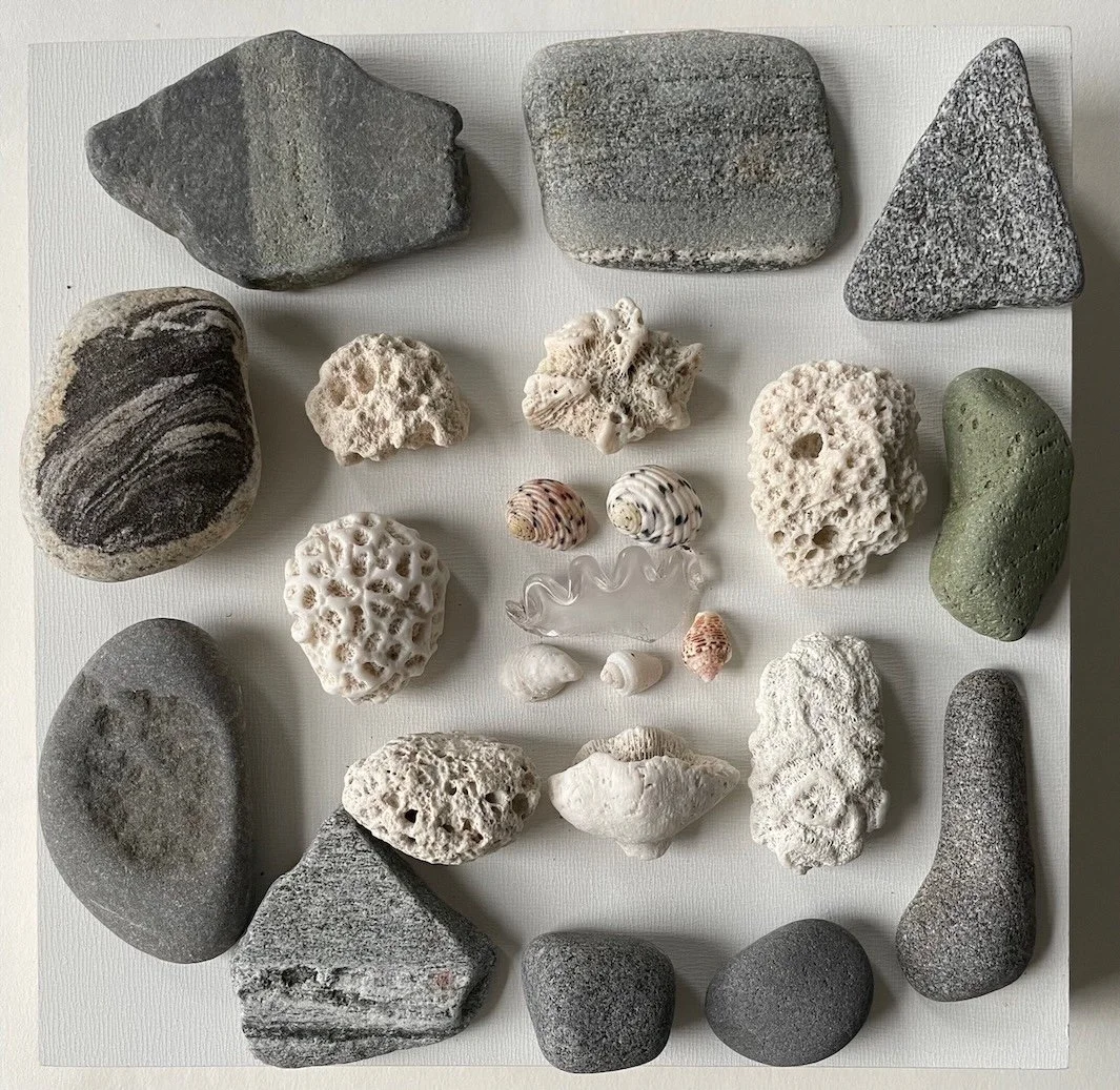 Joy by the Sea, 6x6x7/8” beach stones, coral, sea glass on prepared panel 2023 sold