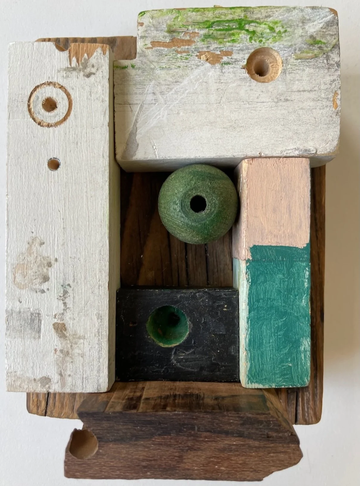 In Bloom, 10 3/4x10x3/4” painted wood scraps, sea glass, beach stone, found metal object 2026