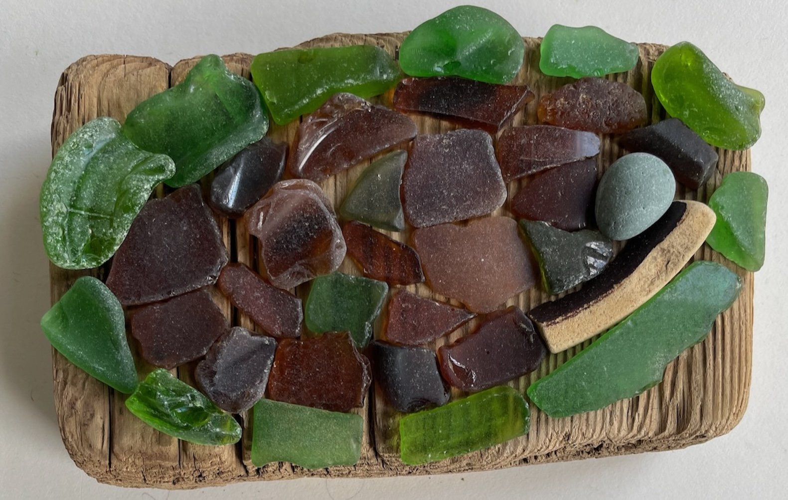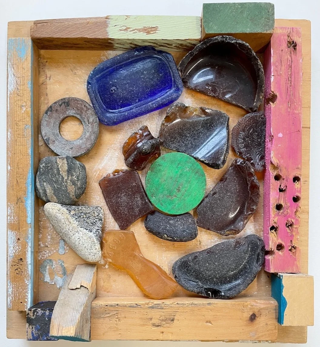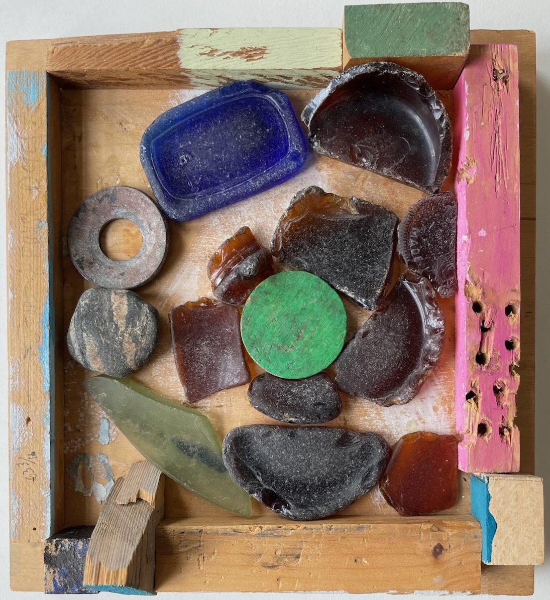 Breakwater 7 1/2x9 1/2x1/4” sea glass, found object, beach stones on painted driftwood, revised 2026