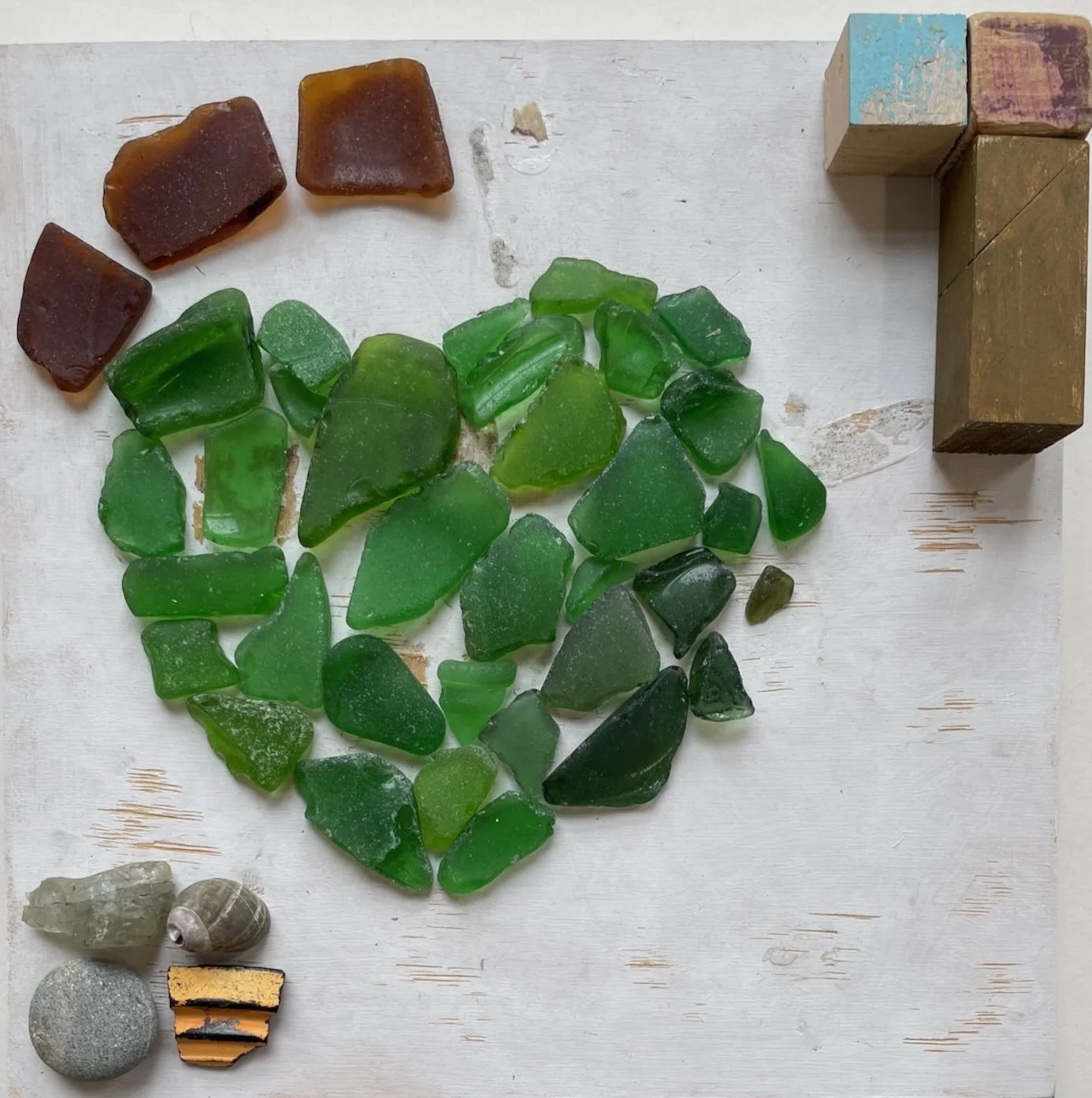 Valentine, 10x10x7/8” wood painted wood scraps, sea glass, beach finds on stressed panel 2026