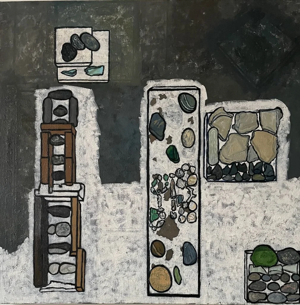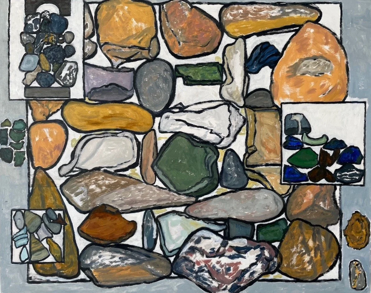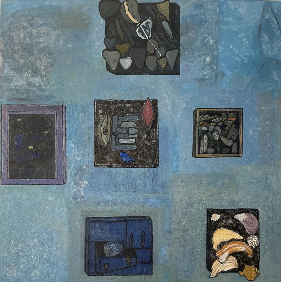 Seven Objects in Blue Space, 8x6x7/8” beach stones on stressed, painted panel, revised 2026