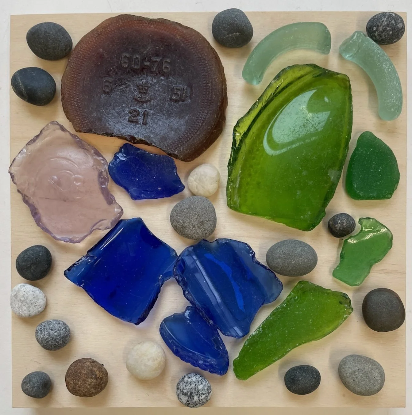 Friendly Molecules, 8x8x7/8” sea and beach glass, beach stones on unpainted panel 2026